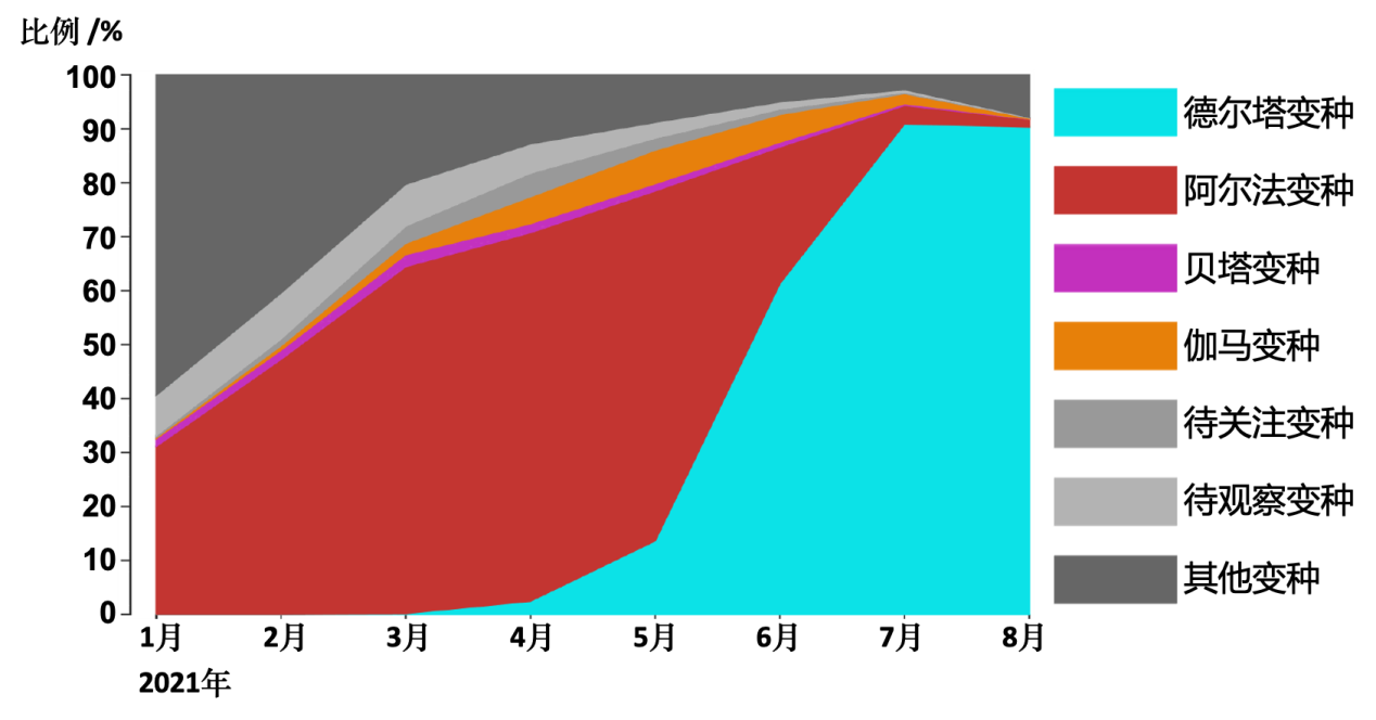 全球流感共享数据库(GISAID)总结了2021年所有在官网提交的新冠病毒序列的比例汇总(图2),可以看到新冠病毒变种在全球感染范围的动态变化。