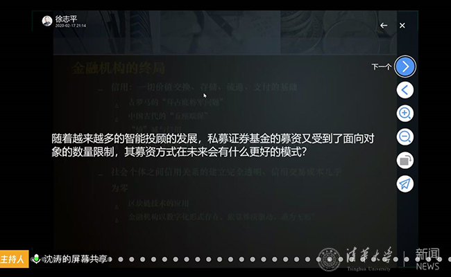 “我是清华人,在这样一个特殊时刻,更应该责无旁贷的与全校师生同心同在!”方方这样说道。课程负责老师、金融系沈涛教授在课后分享说:“我下午五点去方方的办公室与他一起准备直播,对整个流程做认真演练,方方从晚上7点20一直讲到9点30,中间没有休息和喝水,到后面嗓音都有点沙哑。同学们很踊跃,通过雨课堂的投稿和弹幕提出了很多问题,方方对问题做了很详尽的回答。虽然我们因为准备课程都没有吃晚饭,比较辛苦,但还是很有成就感。”