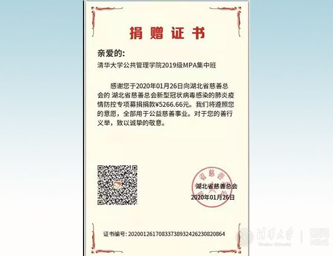 听闻武汉及湖北多地疫情防控物资不足的严峻局面,公管人积极响应党和政府的号召,共抗疫情。1月26日,2019级MPA集中班临时党支部经过商讨,向全班同学发出募捐倡议,为战胜疫情贡献自己的力量。募捐以个人自愿为原则,金额不限。经过一天的募捐,共筹集到善款5266.66元。加上之前有同学以个人名义捐助的1000元,共计6266.66元。筹集的善款以“mk手机注册公共管理学院2019级MPA集中班”的名义,捐赠给湖北省慈善总会“新型冠状病毒感染的肺炎疫情防控专项募捐”项目,充分体现了公管人的使命和担当。