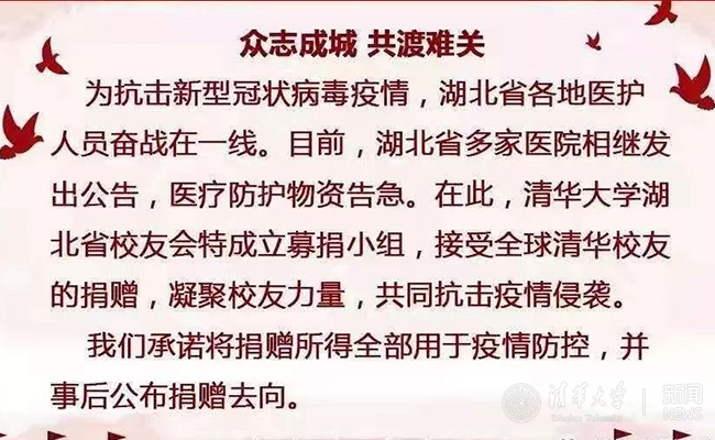 这是一场没有硝烟的战争,所有人都在用适合自己的方式参与其中。面对新疫情,清华校友与校友企业也纷纷在第一时间捐款捐物,援助武汉。