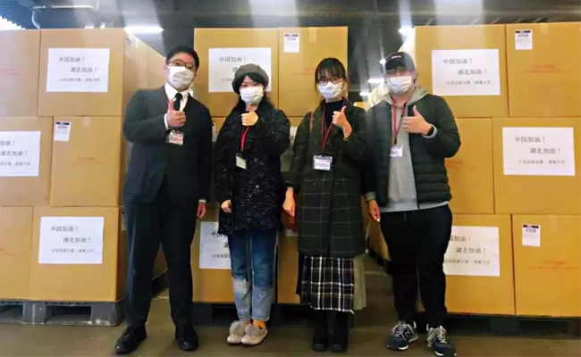 中日创新中心工作人员及日本学生在贴着“中国加油 湖北加油”标签的医用物资前为中国点赞加油