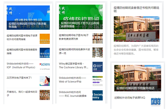 图书馆围绕电子资源服务系统化协同运作,各部门积极配合,成立疫情防控期间特别宣传组,用最快速度收集整理实用的服务信息并及时发布,开展图书馆资源服务特别宣传。图书馆通过学校信息系统(INFO)、图书馆主页和图书馆微信公众号发布《延迟开馆时期图书馆服务指南》《校外远程访问图书馆资源指南》《快速联系图书馆员指南》《代检代查服务指南》《疫情防控期间远程访问图书馆电子资源的情况说明》《疫情防控期间远程访问图书馆电子资源的情况说明》和《校外远程访问Elsevier ScienceDirect、Scopus、Reaxys、Scival的新途径》等信息;发布《疫情防控期间读者借还书相关问题说明》,解答和回应师生关于借还书等相关问题的疑问。