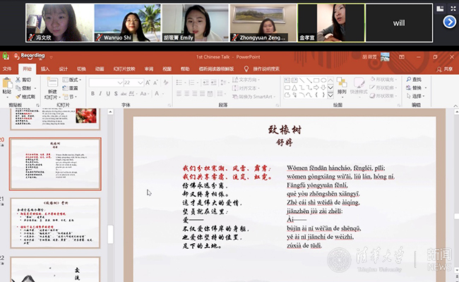 本次工作坊为女生节“情诗专场”,吸引了来自11个院系、10个国家和地区的13名国际生和5名中文导师参加,身处世界各地的国际生在中文导师的带领下学习中国经典诗歌作品,并进行集体朗诵展示和诗歌创作,大家共同度过了一段难忘的“云上汉语说”时光。