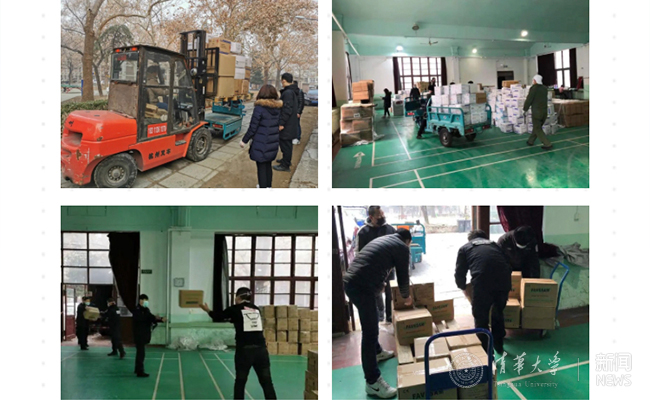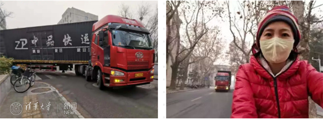 2月12日凌晨1:58,INDITEX物资抵达清华园。一大早,位于校内的物资分拣接力赛便紧锣密鼓地展开:两位来自保卫处交通科的工作人员骑着自行车,一路清障全程护航,为这辆17.5米长的厢式货车开道;校工会教师活动中心作为医疗物资分拣的临时仓库,早已安排好 "重兵把守”,等待物资到来;货车仓门一打开,饮食中心的师傅们也帮忙搬运物资;重型叉车、电动三轮车、人工接力,从卸货到清点,从分拣到再次装车,大家相互配合,与时间赛跑,建起了一条抢救生命的运输线。