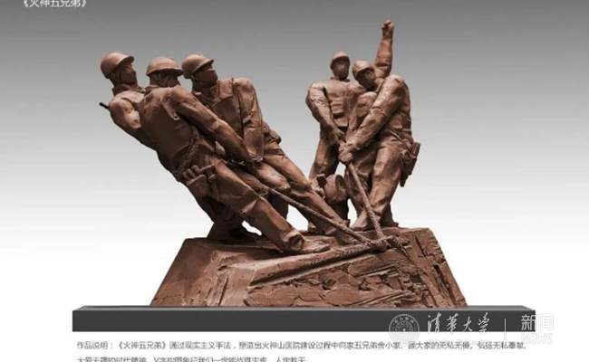 清华美院党委副书记、教授李鹤,以火神山工地五兄弟为原型创作的雕塑《火神山上的向家五兄弟》。