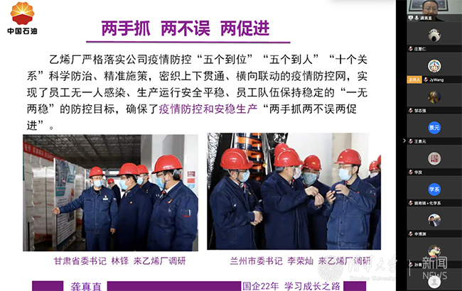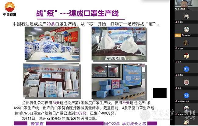 通过龚真直的分享,同学们了解到,兰州石化面对抗疫初期医疗物资紧缺的情况,发挥央企优势,勇担社会责任,及时调整聚丙烯装置生产结构,优先生产医用聚丙烯,保证了下游生产企业的原料供应。同时,仅用24天就建成了第一条医用口罩生产线,3月中旬4条医用口罩生产线和1条N95口罩生产线全部建成投产,开始向社会发售口罩。龚真直所在的乙烯厂则开足马力生产农用薄膜,确保春耕不受影响。以兰州石化为代表的央企堪称抗击新冠疫情的中流砥柱。