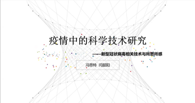 在之后的展示环节中,冯思特和闫韶阳同学展示了疫情防控中的科研技术。同学们从科研贯穿临床诊疗的每个环节、科研与临床诊疗的迭代关系和科学家应肩负使命砥砺前行三个方面切入,介绍了科学研究在病原体鉴别、病毒的人际传播、检测诊断等方面的应用,并回顾了程京院士团队、张林琦教授团队等清华人的抗疫故事,表达了对医学实验班人未来使命的思考,兼具知识性和感染力,同学们获益匪浅。