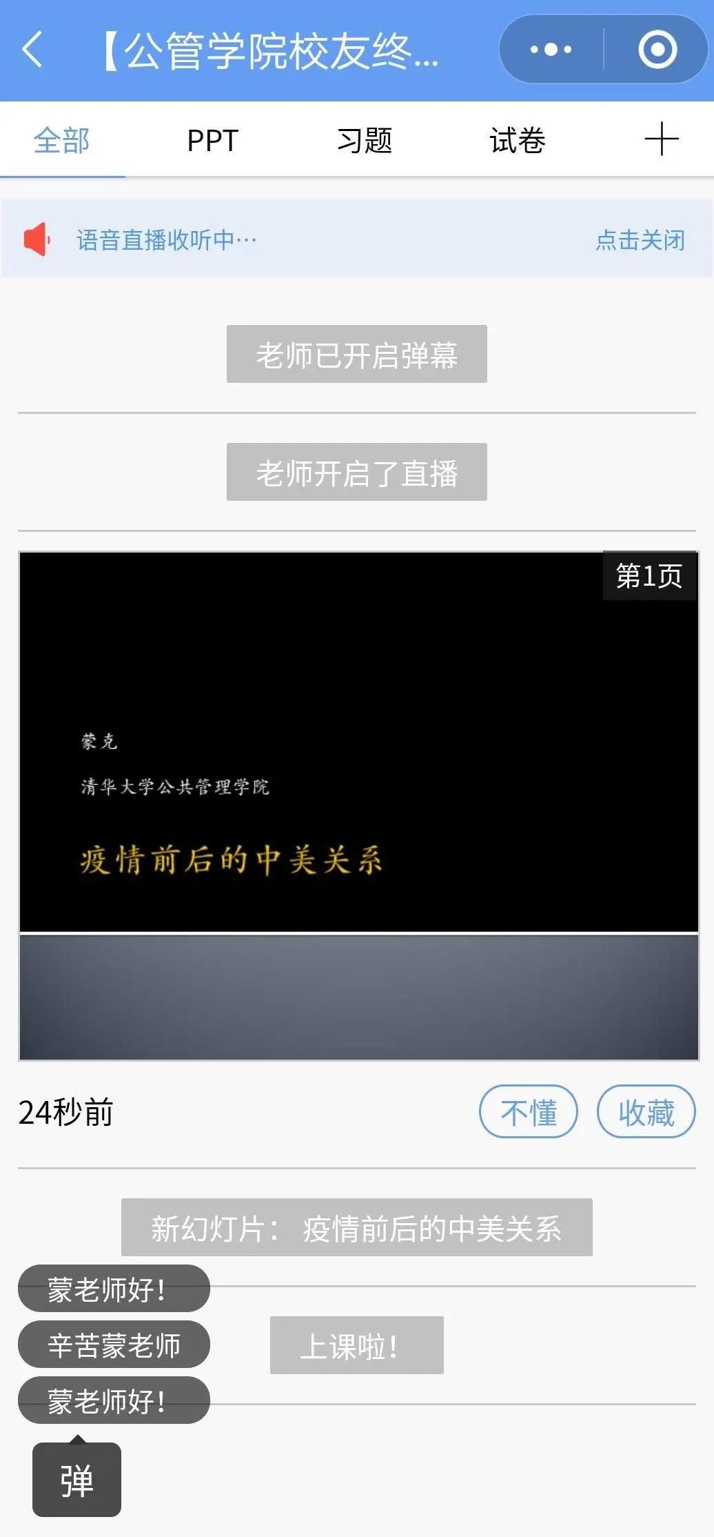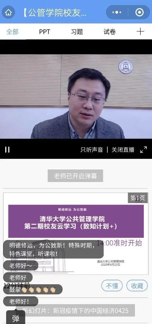 疫情期间,为了落实学校“疫情防控不松懈,教学科研不停步、改革发展不放松”的工作部署,公管学院将校友终身学习计划(“致知计划”)进一步升级,打造了“致知计划+”云上学习活动。在mk手机注册109周年校庆到来之际,公管学院于4月25日举办了“致知计划+”云上学习第二期活动。学院党委副书记、副教授周绍杰,副教授蒙克为校友和师生在雨课堂直播授课。周绍杰以“新冠疫情下的中国经济:短期冲击与长期影响”为题作主题报告。蒙克以“新冠疫情前后的中美关系”为题作主题报告。200多位校友师生观看直播。