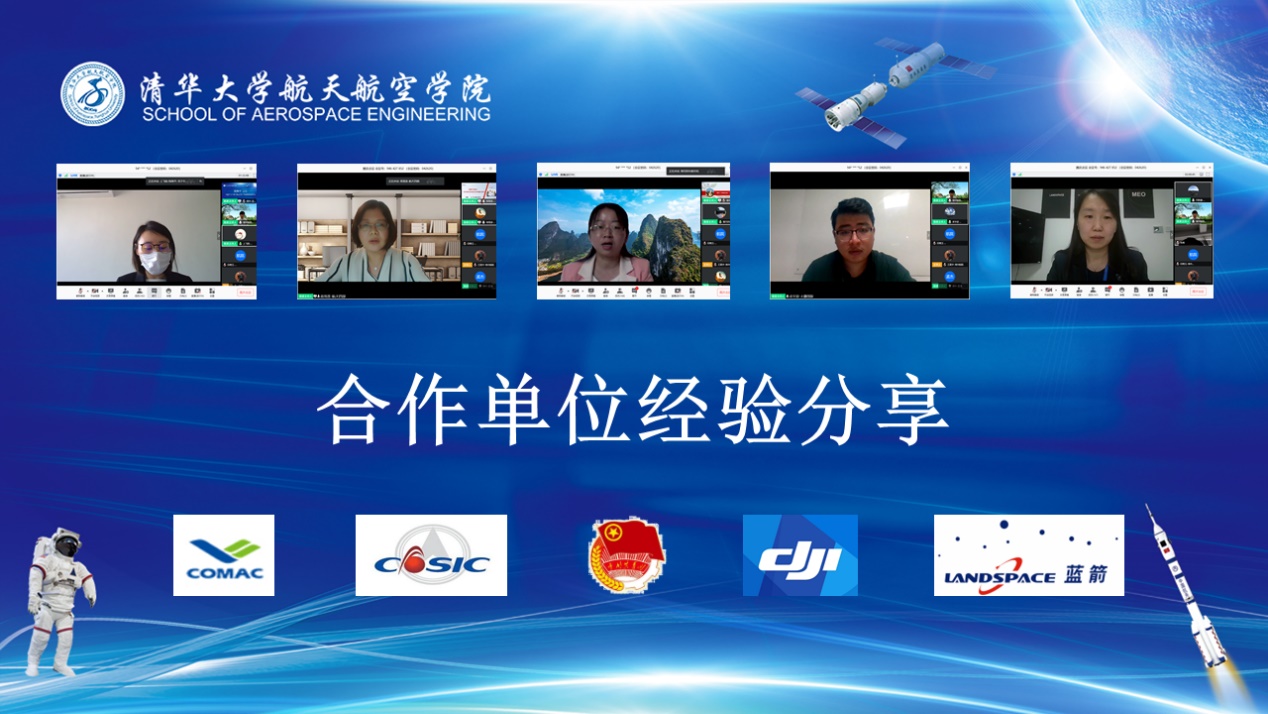 在合作单位分享环节中,中国商飞上海飞机设计研究院教育培训中心陆海平主任介绍了“产品驱动、产教融合、产业育人”的方略,激励广大青年人才投身航空事业;中国航天科工集团第四研究院第四总体设计部高雪莲处长介绍通过“航天四部开拓杯”未来飞行器设计大赛的交流平台,四院四部加强了与高校的沟通协作;共青团黄冈市委洪英副书记详细介绍了黄冈市校合作和人才引进政策,热切期待广大清华学子的到来;大疆创新科技有限公司卓宇迎经理展示了“RoboMaster”协同育人的创新型项目在与国内外高校合作过程中丰硕的育人成果;蓝箭航天空间科技股份有限公司闫新建总经理从公司的雄厚实力和产学研战略人才培养等方面展示了学生实习实践的优势。五家单位代表分别从自身单位的优势、校企合作、人才培养等方面进行介绍,为同学们实践就业提供新思路,为其他参会单位探索人才培养新模式提供借鉴,为校企合作拓展新渠道。