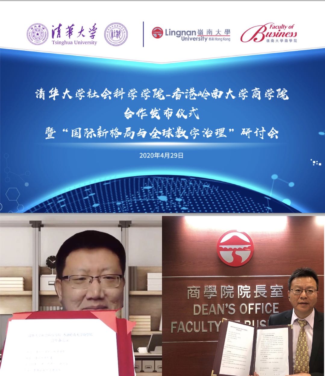 随后,在双方领导和到场嘉宾及在线观众的共同见证下,mk手机注册社会科学学院副院长赵可金教授与香港岭南大学商学院院长冷明明教授共同签署了合作备忘录,mk手机注册社会科学学院继续教育中心主任曲炜对双方即将开展的合作项目进行了发布。