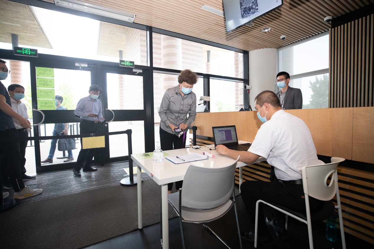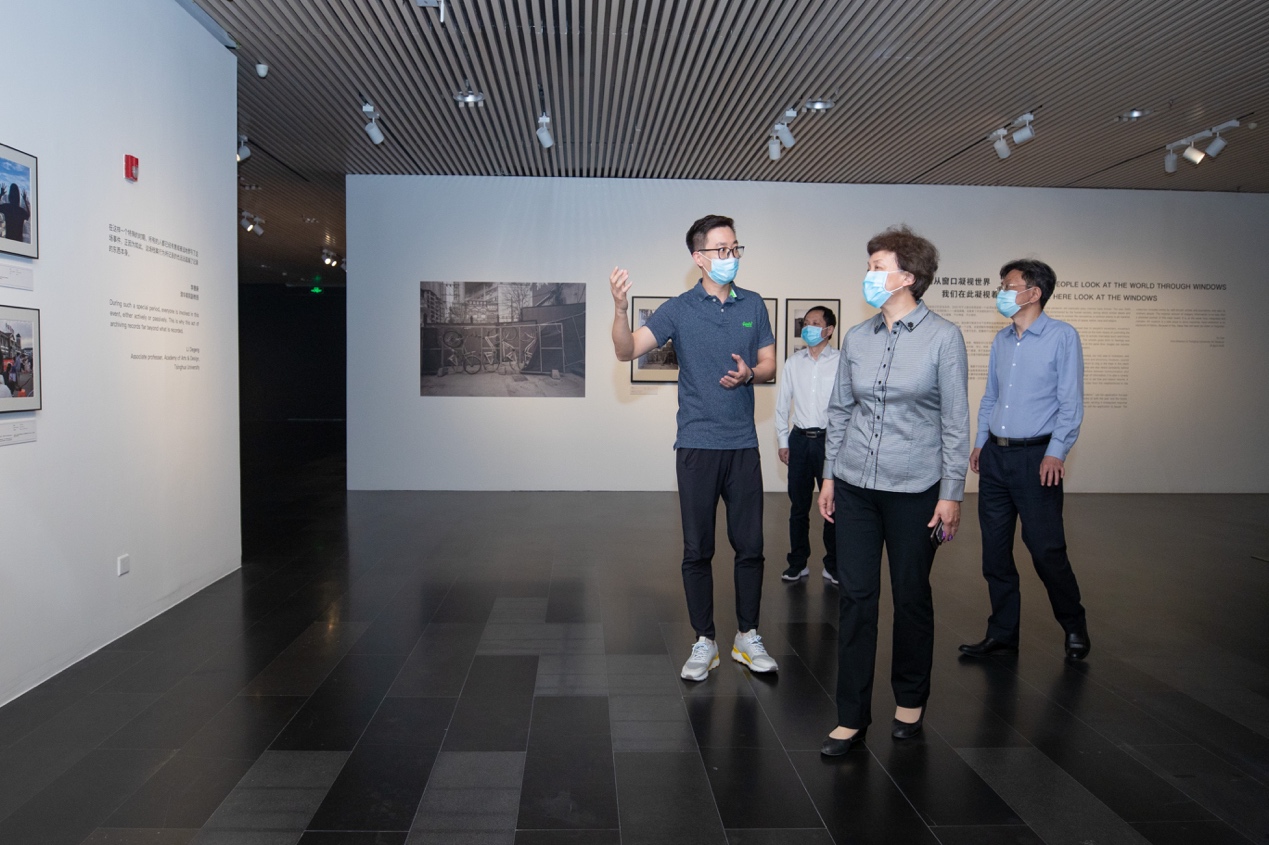 在艺术博物馆门口,陈旭等主动接受体温检测、刷卡登记。“你们辛苦了!今天有多少师生来参观?有几场展览?工作人员都上岗了么?”陈旭、李一兵对值班人员表示亲切慰问,并参观了《窗口2020——疫情时期图像档案展》,详细了解展览展出、参观人数、预约机制、值班人员、毕业生返校后的工作预案等基本情况,对馆内消毒、出入测量体温登记、人流控制等细节十分关注。