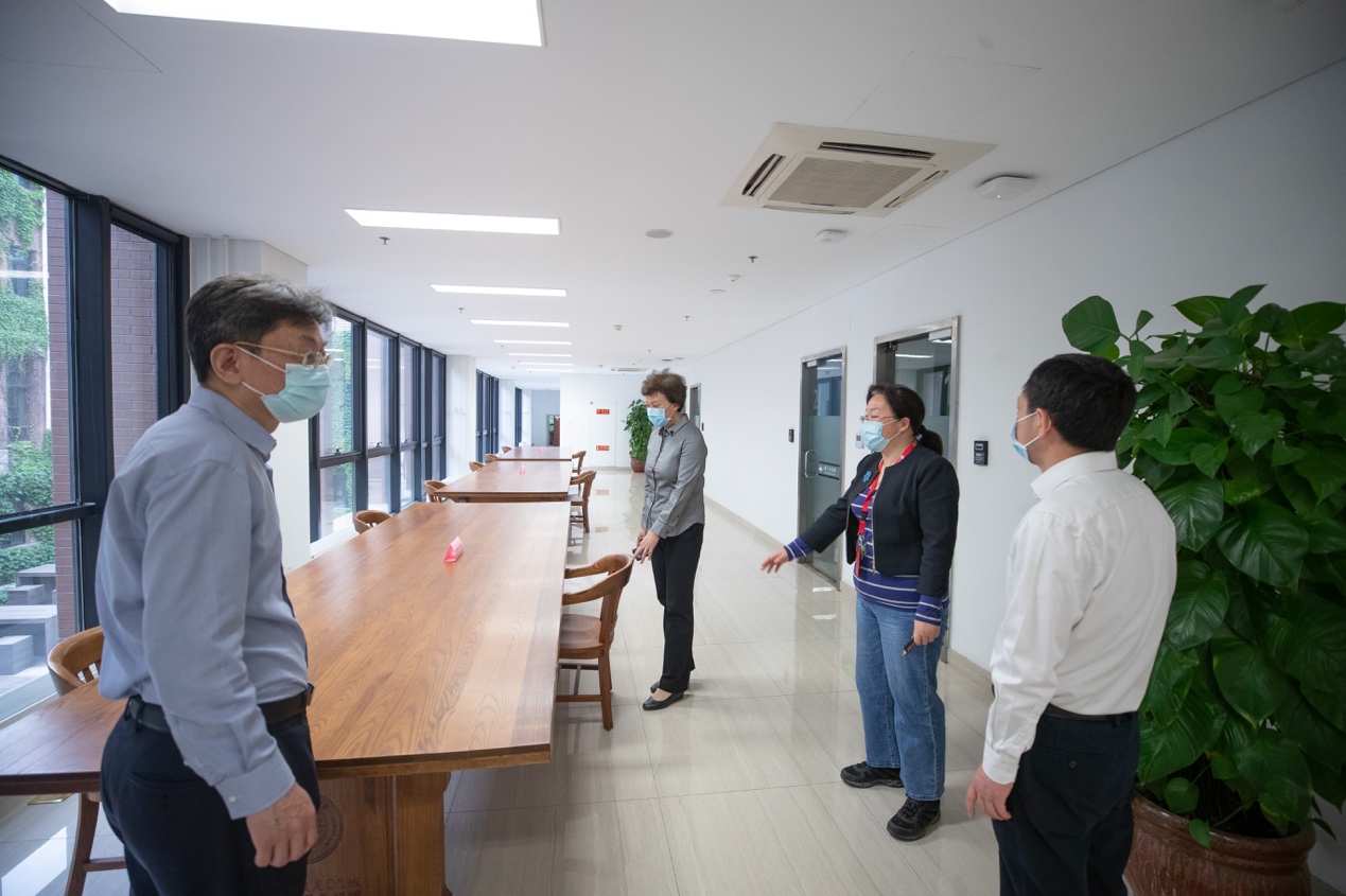 最后,陈旭一行来到图书馆总馆,向负责人认真询问特殊时期的配套措施、师生自习和借阅情况、座位布置、在岗情况、信息系统建设等,并参观了音乐图书馆,了解运行状况和建设进程。