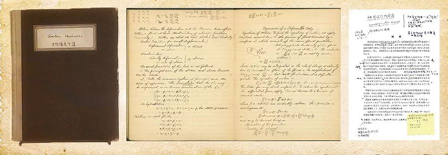 林家翘先生早年求学时留下两本笔记:左为1937年听周培源先生讲“流体力学”所作的笔记,中为1939年听王竹溪先生讲“量子力学”的笔记。林家翘的笔记字迹娟秀、清晰工整,当年清华的专业课程全部为英文授课,所有笔记均为全英文书写。而右边则是他晚年回到清华后批阅的学生洪柳的博士后出站论文。翻开论文首页即可看到林家翘的批阅,仅摘要中修改痕迹就有近20处,其中包括对标点符号的修改。他还在旁边贴下便签纸,上边写有“标点符号,是否有法改善?改后我可便于阅读?……”后又用黑色签字笔谦虚地写下“恐怕以上建议,当有不足之处”。作为20世纪五六十年代就以流体湍流理论、天体物理享誉国际的大师,95岁高龄的林家翘仍然争分夺秒致力于学术前沿,并亲自指导年轻教师和学生做科研。