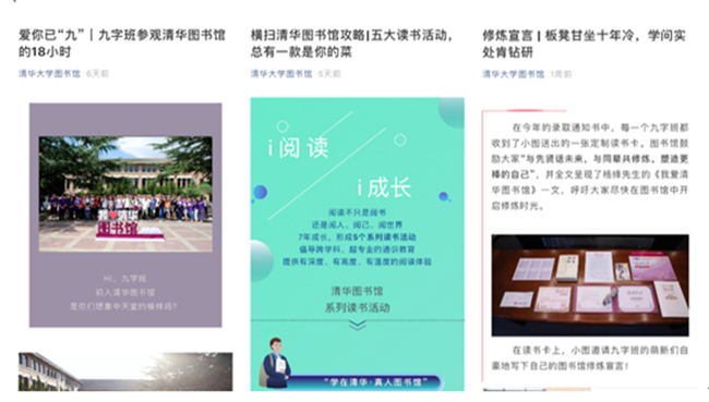 用微信公众号连接线上线下互动,是今年图书馆迎新的亮点。图书馆将线上渠道与线下互动相结合,非常强调与九字班新读者的互动,专门制作了图书馆迎新主题三大系列,包括爱你已“九”系列、横扫清华图书馆攻略系列、修炼宣言系列。