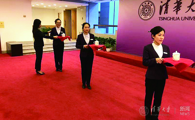 2018年法国总理来访,会前半小时内,服务人员巡场时发现布场公司在地面临时铺设的线路上仅虚搭了一下胶布,人员进出不仅容易绊倒,还易引发设备故障,立即按照自己的标准,重新做了卡槽固定,保障了接待的顺利进行,也赢得了布场公司的赞许。校内其他单位遇到接待任务,作为清华牌的会议服务也义不容辞地为兄弟单位提供支援。