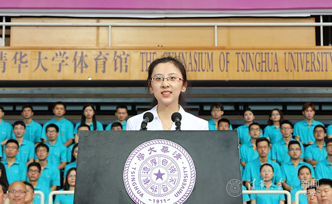 金融学院硕士生王铭薇同学代表新生发言。她说自己被清华优质的学习生活环境、雄厚的师资力量和顶尖的学术水平所吸引,更被传承百年的清华精神所感动。今天自己将从这里出发,继续践行着“行胜于言”的校风,用行动表明对初心与梦想的坚守,去拥抱这个伟大的时代。