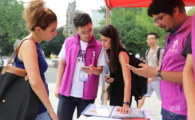美明娜(左一)在国际学生报到处 杨思维 摄
