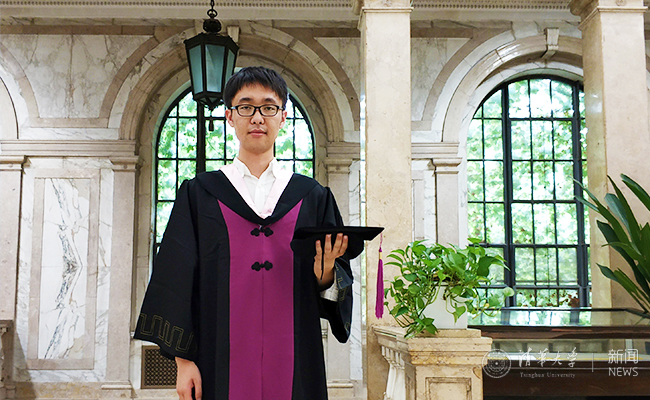 李亚东身穿学士服在图书馆老馆拍照留念