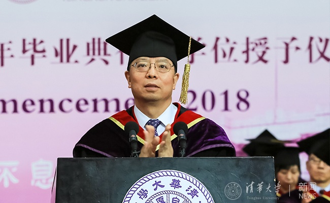 邱勇首先向毕业生及其家人表示热烈祝贺,向悉心指导他们的老师表示衷心感谢。邱勇回顾了2018届本科毕业生与新百年的清华共同成长的四年——四年间,清华建成了全球最大的校园创客空间iCenter,制定并实施了清华历史上第一个全球战略,全面实施大类招生和大类培养,大力推进通识教育课程建设,持续增设第二学位和辅修专业,为同学们的自主成长提供了更大的空间。“一番新风景,为君开设”,邱勇深情地对同学们说,“在我眼中,成长中的你们才是清华园中最美的景色”。