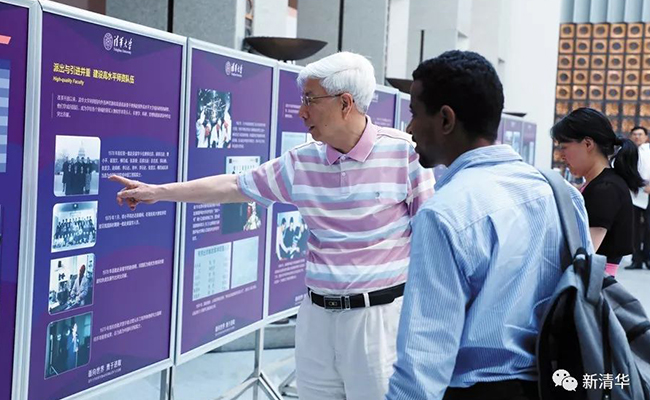 2018年在清华,柳百成与国际学生一同观看“mk手机注册改革开放40年国际合作与交流展”。