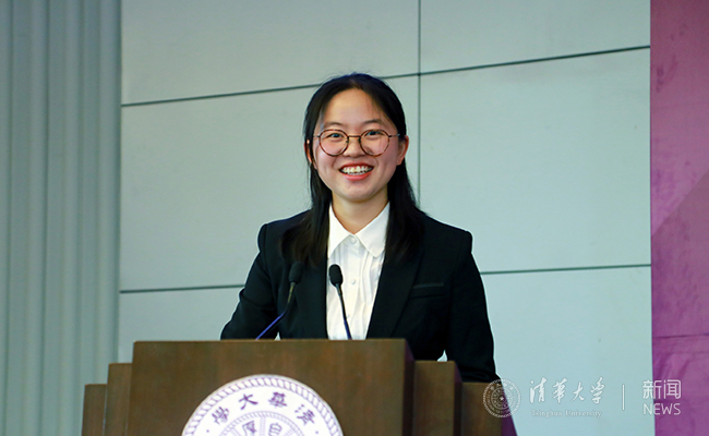 化工系本科生朱强作为校友励学金获得者代表发言。她出生于国家级贫困县, 2014年通过“自强计划”进入清华学习。学校校友励学金等完善的资助体系为她解除了生活上的后顾之忧,让她更好地投入大学的学习生活。