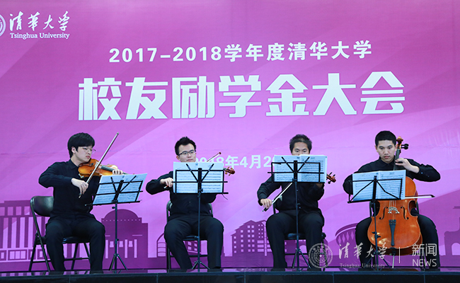 会上,学生艺术团演奏了弦乐四重奏《今夜感受我的爱》,以此表达清华学子对母校的热爱和对校友深情的感激。获得校友励学金的学生代表还向出席大会的校友赠送了亲手制作的版画,并与校友们合影留念。