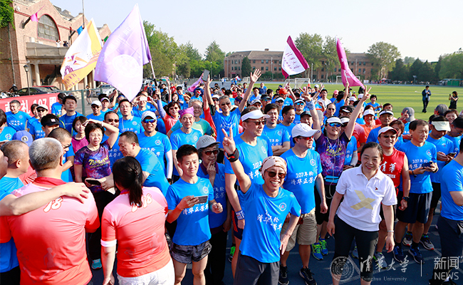 早晨7点半,大家一起高喊“2018,清华正芳华!”的校庆主题词,随即鸣枪起跑。他们以轻松配速慢跑,跑完第一圈高呼“清华,1911!”,随后每完成一圈,就增加一个年份。“健康工作50年,幸福生活100年”的响亮口号响彻西操,现场热烈的气氛传递着“无体育,不清华”的精神,也深深感染了西操附近围观加油的师生校友们。