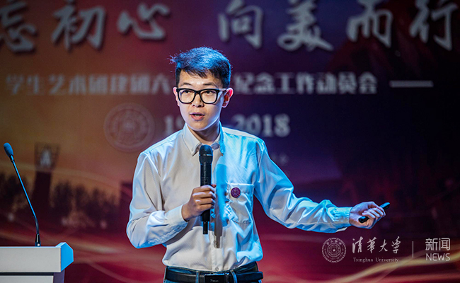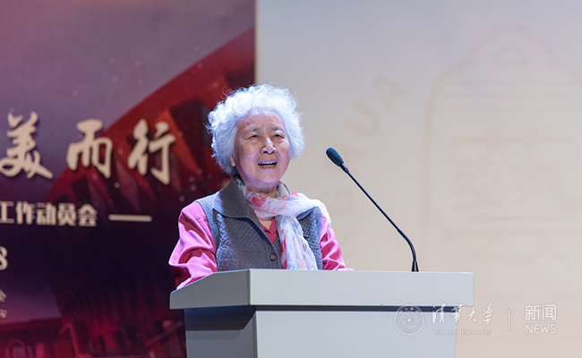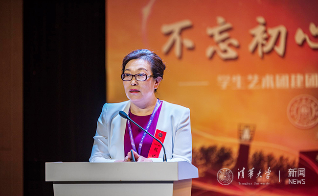 动员会上,三位艺术团团友先后发言。1955 级舞蹈队队友、艺教中心首届主任郑小筠回顾了艺术团的发展历程。从为鼓舞清华学子行军劳作而成立的民兵师文工团,到经济困难时期仍在坚守的文艺社团,再到改革开放后蓬勃发展的艺术团,尽管在不同时期有不同的称呼,但艺术团的使命与担当始终不变。郑小筠号召年轻的团员们继承艺术团优良传统,不忘初心、努力奋斗。