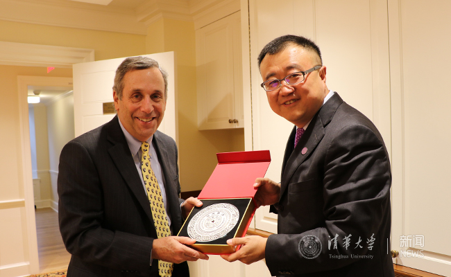 杨斌向哈佛新任校长比考教授赠送清华纪念品