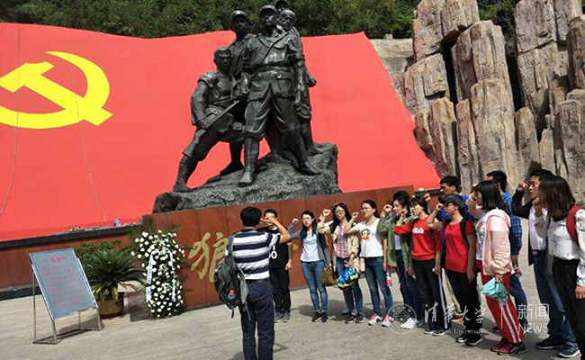 在“狼牙山五壮士”的纪念雕塑前重温入党誓词