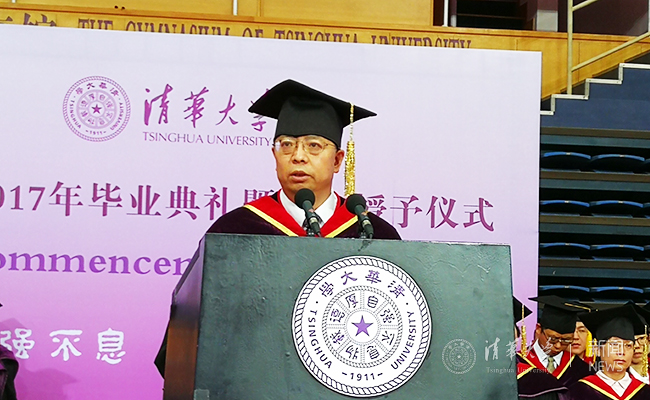 我希望你们作为清华人,自觉践行“行胜于言”的校风,拒绝浮躁。我更希望你们在枝蔓丛生的世界里砥砺前行,心系远方,拥有一份属于自己的情怀。也许有人认为情怀是一种易碎的奢侈品,难以承载生活的重力。但是你们要记住,正是美好高尚的情怀决定了人生的高度。