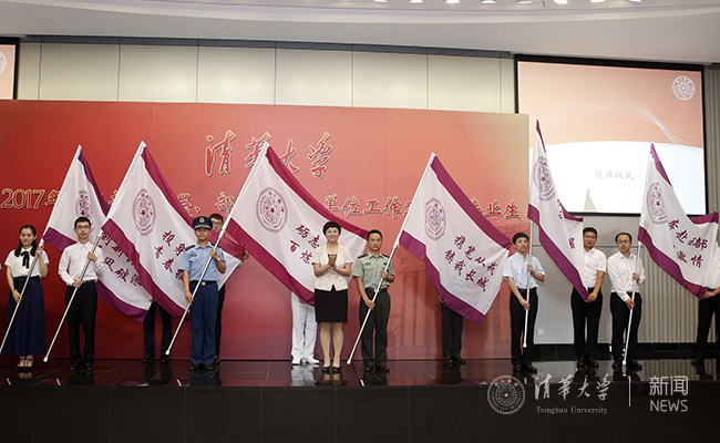 在随后举行的出征仪式上,陈旭将六面写有“奔赴西部,燃烧激情”“扎根基层,放飞梦想”“携笔从戎,铸我长城”“投身主流,青春报国”“创新创业,乘风破浪”“砺志空天,百炼成钢”的旗帜分别授予即将前往西部、基层、部队、重点单位工作及创业的毕业生代表。