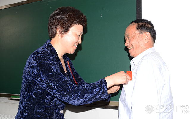 陈旭为校友佩戴毕业50周年纪念章。陈宇 摄