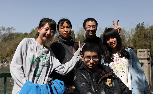 朱晓鹏和母亲、同学一起出游。