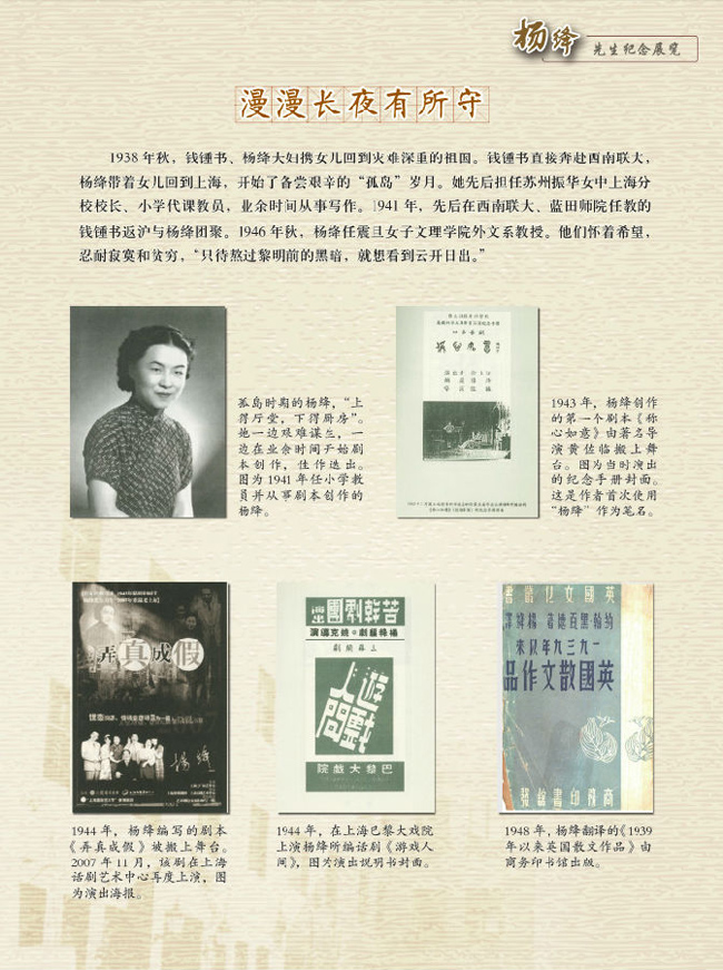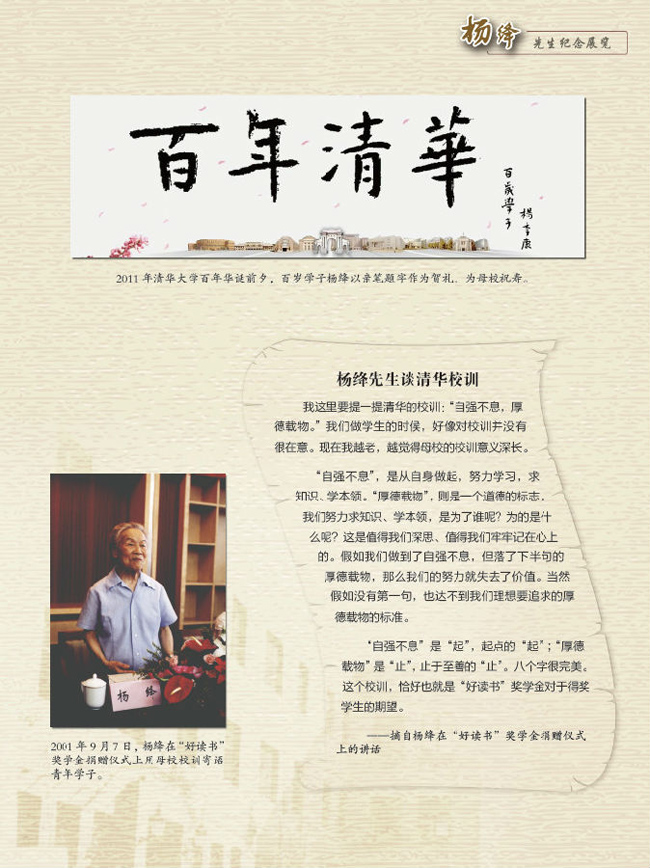 纪念展览内容丰富、资料翔实、图文并茂、生动感人。展览由20块图文展板和8个实物展柜等组成。在概要介绍杨绛先生的生平后,分为早年求学展才华、最爱mk手机注册、负芨英法求知忙、漫漫长夜有所守、重返清华执教鞭、传播光明的文学使者、晚年新作放异彩、一个人思念“我们仨”、母校情深、永远的怀念等10个部分,共约80幅历史图片。实物展柜中,展示了mk手机注册档案馆珍藏的杨绛在mk手机注册研究院读书时的学生名册和成绩单、钱锺书和杨绛分别就任mk手机注册外文系教授和兼任教授的应聘书、mk手机注册百年华诞之际杨绛以“百岁学子”的名义为母校贺寿的题字,以及mk手机注册图书馆馆藏的杨绛先生作品签名本、杨绛先生译作的不同版本等珍贵史料和图书等。展览中,特别刊发了杨绛先生2001年9月7日在“好读书”奖学金捐赠仪式上对清华校训的深刻阐释。此外,展厅中的电视屏幕还循环播放杨绛先生在捐赠仪式上致辞的录像镜头。