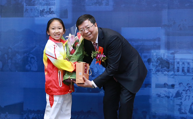 “清二代”给邱勇校长献花。记者 苑洁 摄