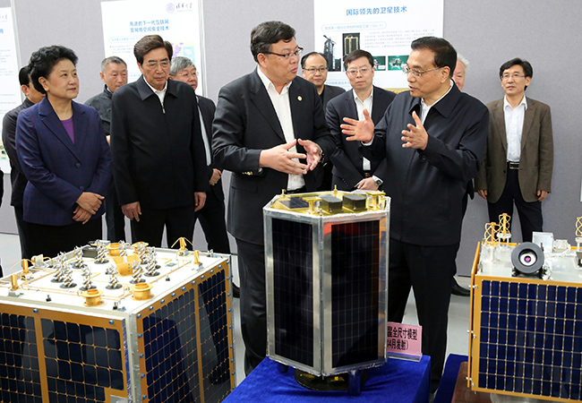 李克强总理听取尤政院士关于小卫星的介绍。
