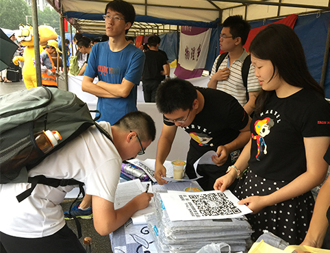 在各院系迎新点,统一着装的迎新师生有条不紊地为新生报到提供导引。美术学院色彩灵动的宣传画、土水学院可爱的卡通人偶和计算机系水墨风的大幅展板成为现场亮丽的风景。除了传统的入学报到手册外,很多院系还张贴出醒目的二维码,新生只需掏出手机轻轻一扫,就能迅速了解自己所在院系的情况,获得入学指引。