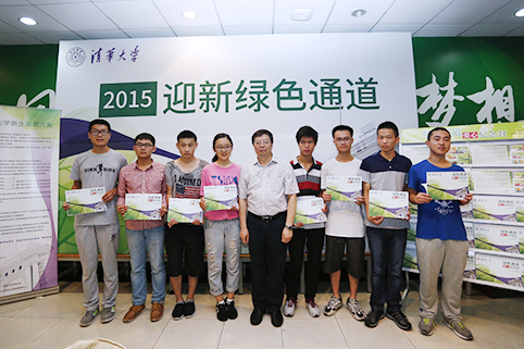 邱勇向走“绿色通道”新生赠送“爱心纪念封”并合影留念。记者 张 宇 摄