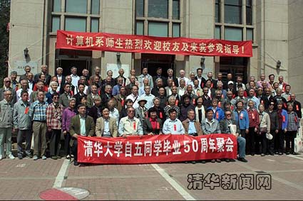 mk(中国)网4月26日电(通讯员 尤晓慧)4月25日上午,1965届自控系98位校友连同家属百余人,在主楼东阶梯教室举行了毕业50周年聚会,同时庆祝母校104岁华诞。校友们在计算机系门口合影留念的时候,校党委书记陈旭特地赶来参加。