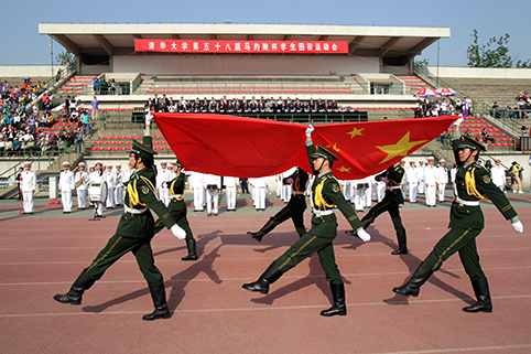 早上不到7点30,参加运动会开幕式的同学们已经整装待发。上午8点,随着校军乐队激昂的乐声,国旗班成员、校旗方阵及各院系运动员方阵依次入场,主席台上全体领导起立,为同学们鼓掌加油。整齐的着装、铿锵有力的口号,奋发向上的精神,各方阵依次入场,展示了清华学子朝气蓬勃、积极向上的风采。环境学院身着统一的运动套装,活泼幽默的吉祥物引得观众们会心微笑;土木建管系的同学们高喊“土木体育,再创辉煌”的有力口号,饱含激情地喊出了新时期土木人的自信与勇气。水利系以整齐的步伐展示风采,也展示着本次参赛的拼搏梦;连续四年夺得马杯甲组冠军的自动化系打出横幅“自动化必将用自己的拼搏震撼东操的大地”,他们的口号是“马杯精神 代代相承 自动化系 永远力争”;而走过主席台的校友方阵更是搏得了看台上的阵阵欢呼和热烈掌声,他们从祖国各地、甚至从大洋彼岸赶来,只为在母校生日时欢聚,方阵中的许多校友已经为祖国健康工作了50年,他们将在运动会上再展风采,传承清华体育精神,重温当年美好时光。