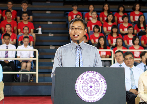 图为陈巍教授在本科生新生开学典礼上的发言。记者 智 斐 摄