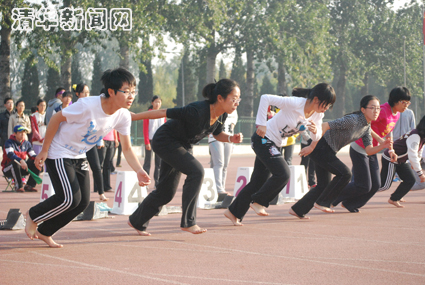 图为参赛学生赤足起跑。