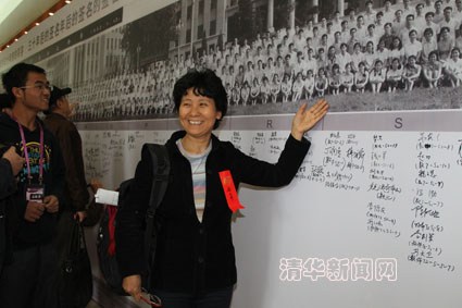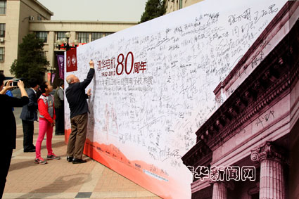 图为系友在电机系系庆80周年背板上签名。记者 郭海军 摄