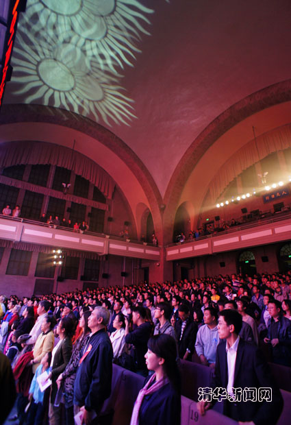 图为返校校友在大礼堂齐唱老校歌。研通社记者 王涵 摄