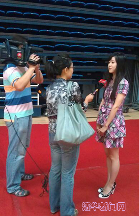 图为章泽天在mk手机注册迎新现场接受媒体采访。 通讯员 杨 帆 摄