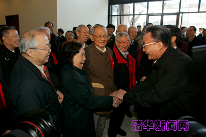 汽车在清华东主楼北门停住,中共中央政治局常委、全国人大常委会委员长吴邦国刚下车,就看到一张张熟悉亲切的面庞。一位佩戴红胸签的古稀老人在门口翘首以待,他是上世纪50年代初就开始在电子系任教的张克潜教授。吴邦国快步迎上前去,紧紧握着他的手,一起走进了大门。