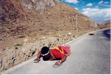 大昭寺门口、扎什伦布寺门口、布达拉宫门口等,一排排的信徒在那里五体投地、顶礼膜拜。他们口中念着六字箴言,双手合十,从头顶、胸前再到腹部,再屈膝跪地,双手贴地向前滑伸,将整个身体引贴向地面,然后起身重来,周而复始,一天不知他们要重复这个动作多少遍。门口的这些大青石板上留下信徒们深深的痕迹,石板已被磨光滑,呈黑色,泛着油光。在通往拉萨的各条道路上,也不知道还有多少人正在以身量地向这些地方兼程而来。