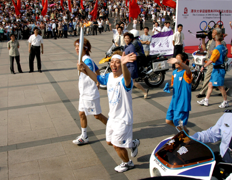 【新闻中心讯 记者 周襄楠 摄影 郭海军】“羽·泉!羽·泉!”从羽·泉在mk手机注册主楼前接到火炬开始,羽·泉就成为人们疯狂追逐的焦点。两个人染成的黄头发,在蓝白相间的火炬手的服装的映衬下分外显眼,他们一在主楼前下车就向大家挥手,引得周围的同学尖叫、大喊:“羽·泉!羽·泉!”