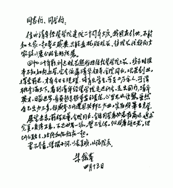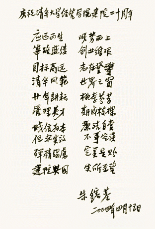 校长顾秉林为院庆致辞。他回顾了清华经济管理教育的历史,对朱镕基同志为学院发展所做出的贡献表示崇高的敬意和感谢。他说经管学院建院20年来,在广大师生员工的共同努力下,在社会各界的支持下,艰苦创业,在学科建设和人才培养等方面都取得了很大的成绩。经管学院的发展及其所取得的成绩,再一次证明了清华一直坚持的办学理念,即:“自强不息、厚德载物”的清华精神是事业发展的支柱;师资队伍建设是创建一流大学的关键;人才培养质量是办学的根本;开拓创新是发展的灵魂。他说,当前提高水平,突出特色,是学校发展人文、社会科学和艺术学科的总体思路,希望经管学院在今后的发展中要放眼世界,立足国内;放眼未来,立足当前;坚持科学的发展观,努力做到以人为本,全面可持续发展,在今后的发展过程中迈出新的步伐,为学校做出更多的贡献。